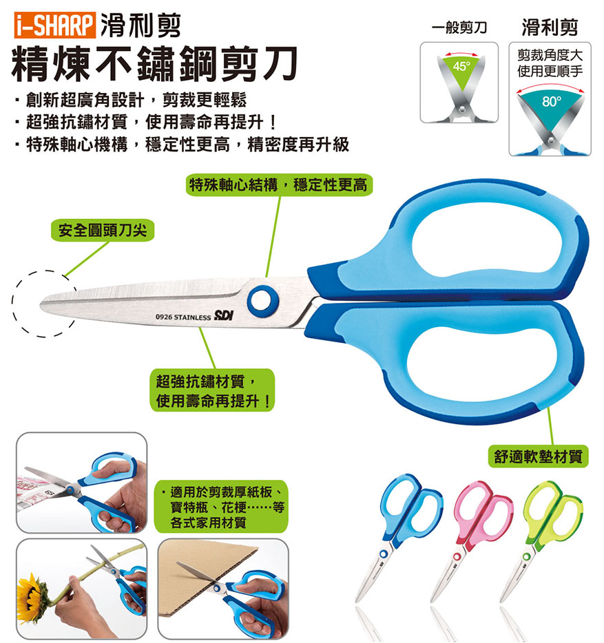 ? 立异超广角设计,剪裁更轻松 ? 超强抗锈材质,使用寿命再提升! ? 特殊轴心机构,稳定性更高,精密度再升级 ? 圆头式设计,使用最宁静 ? 软握把设计,防滑又舒适